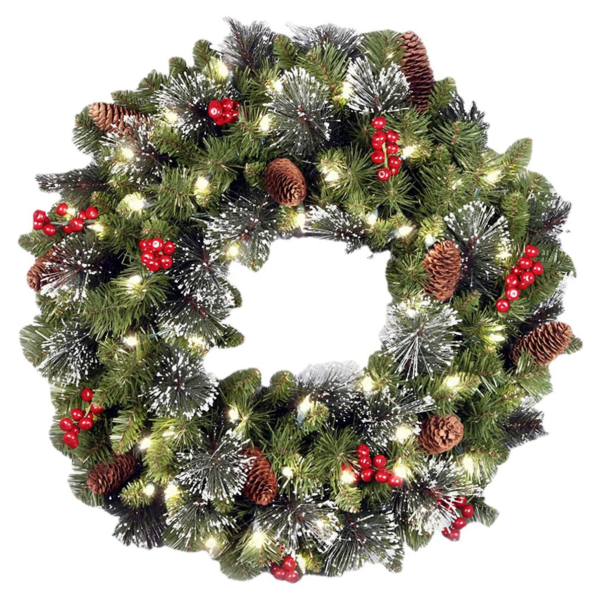 LED-lit artificial Christmas wreath adorned with pinecones and red berries